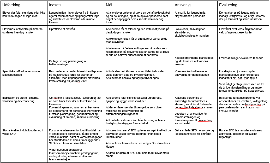 Med udgangspunkt i elevtrivselsmålingen, har personalet i august 2023 analyseret og planlagt indsatser på klasseniveau, som direkte tager udgangspunkt i resultaterne fra trivselsmålingen.